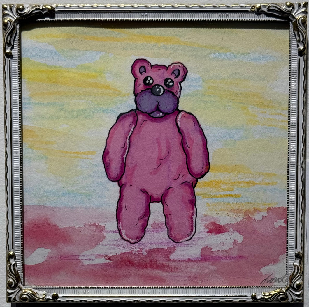 "Rosa bamse" Kunstner, Erlend Mortensen. Original tegning. Størrelse, ferdig innrammet, 13x13. Bildet kommer ferdig innrammet med ramme som kunstner har fått av besteforeldre. Pris med innramming; 2.000,-.