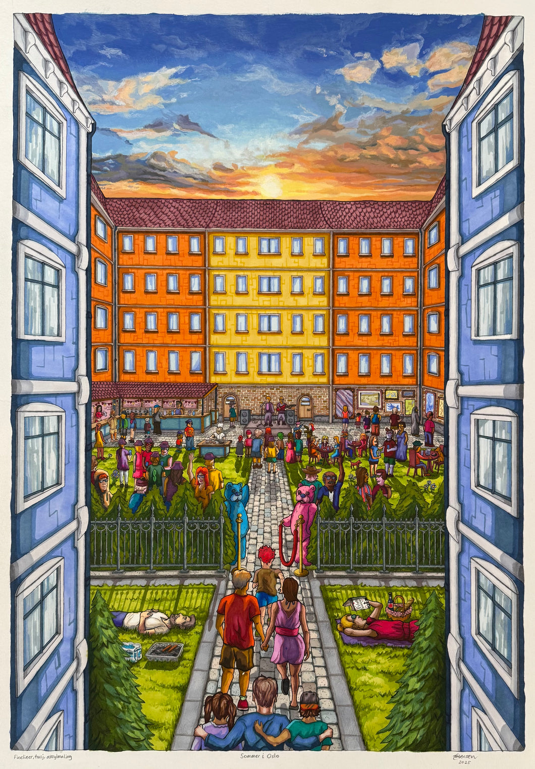 "Sommer i Oslo" Kunstner, Erlend Mortensen. Original tegning. Størrelse, ferdig innrammet, 90x71. Bildet kommer ferdig innrammet med sort list, passepartout og kunstglass. Pris med innramming; 36.750,- (Inkludert 5% kunstavgift).Â